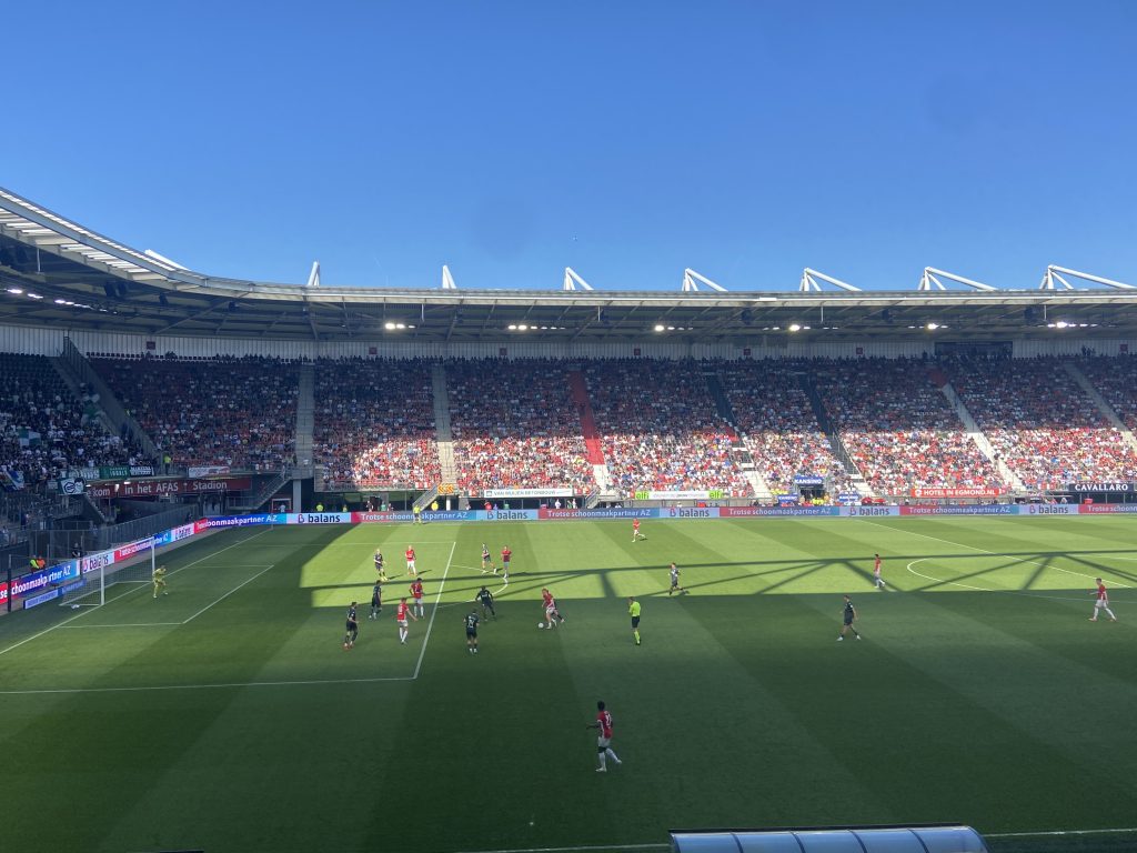 FC Groningen komt in het zonnige Alkmaar al vroeg op achterstand. In de negende minuut komt Denso Kasius op aan de rechterkant en ziet zijn lage voorzet binnen getikt worden door AZ-aanvoerder Mijnans, die zijn 100ste wedstrijd in het shirt van AZ speelt. Hoewel de FC nog aardig mee voetbalt, komen de Groningers niet tot grote kansen. Leandro Bacuna ziet een vrije trap naast gaan en Luciano Valente stuit twee keer op AZ-keeper Owuso-Oduro.
