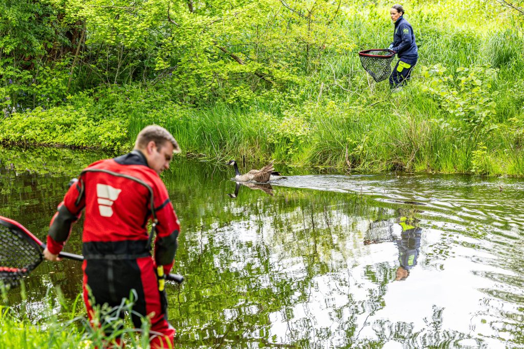 Medewerkers van Dierenambulance Groningen en duikers van de brandweer hebben zondagmiddag aan het Geert Teispad een gans met een gebroken vleugel gered. Dat meldt nieuwsfotograaf Rick ten Cate van tencatefotografie.nl.