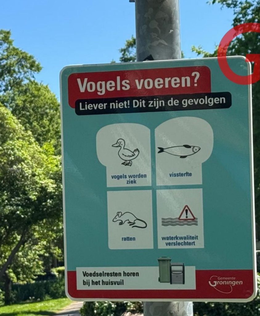 ‘Vogels voeren? Liever niet!’, dat is de boodschap die de gemeente Groningen afgeeft met het plaatsen van informatieborden bij verschillende vijvers. Op de borden staat uitgelegd waarom de vogels beter niet gevoerd kunnen worden.
