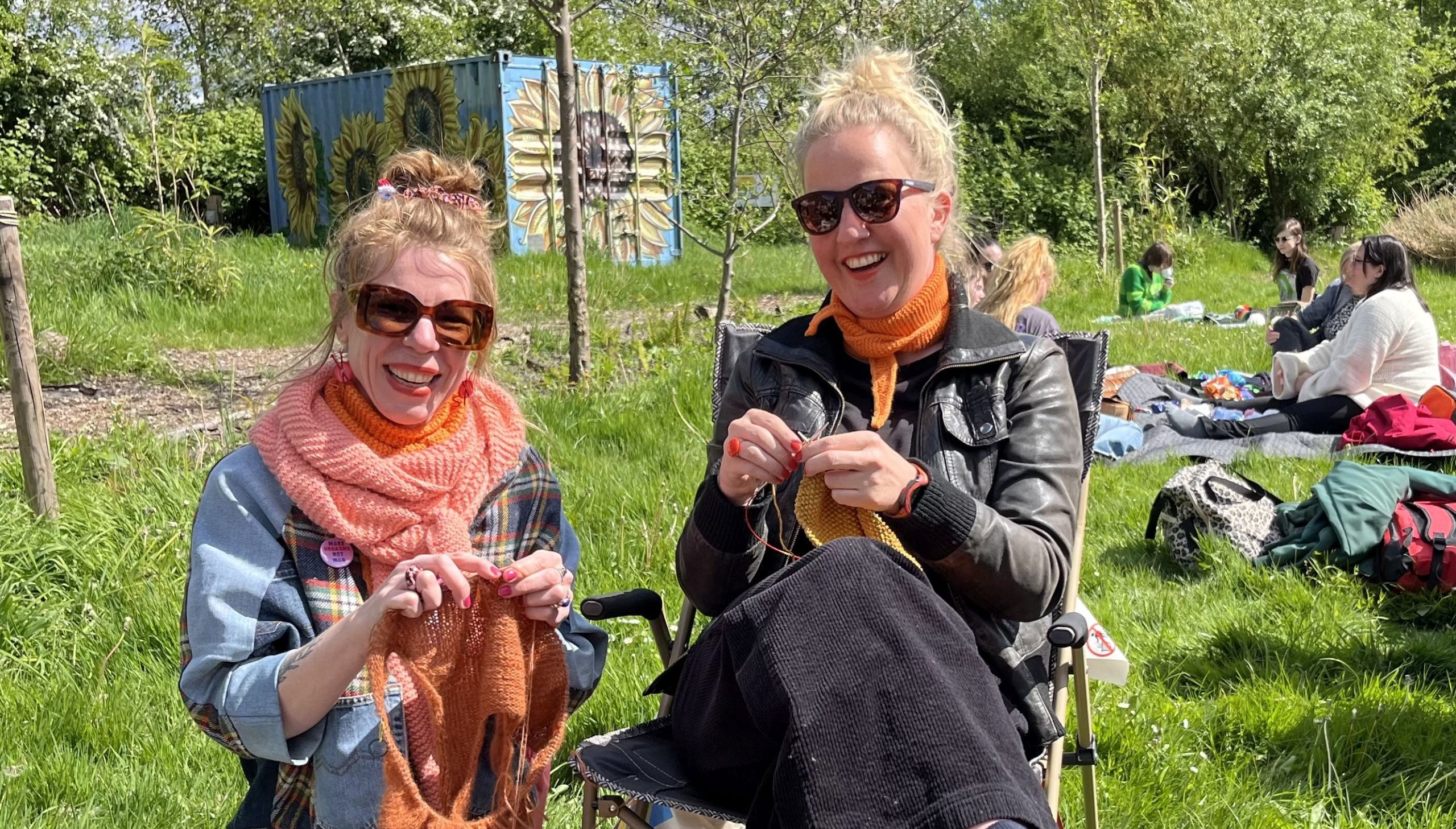 Op het Suikerterrein kwamen maandagmiddag zo’n honderdvijftig mensen samen om te breien. Deelnemers brachten hun breiwerk en picknick mee voor een zogeheten Pick-Knit.