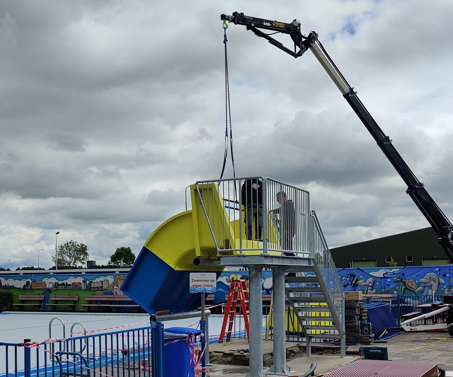 “De glijbaan staat er op dit moment voor de helft”, vertelt Marian Hegeman van het zwembad. “Afgelopen week is de trap, die toegang biedt tot de glijbaan, geplaatst. Ook is het eerste deel van de glijbaan op zijn plaats bevestigd. De verwachting is dat het werk komende week afgemaakt kan worden. Daarna moet het nog getest worden. Maar op dit moment zetten we voorzichtig in op de ingebruikname in het Pinksterweekend. Dat zeg ik wel met zeker voorbehoud.”