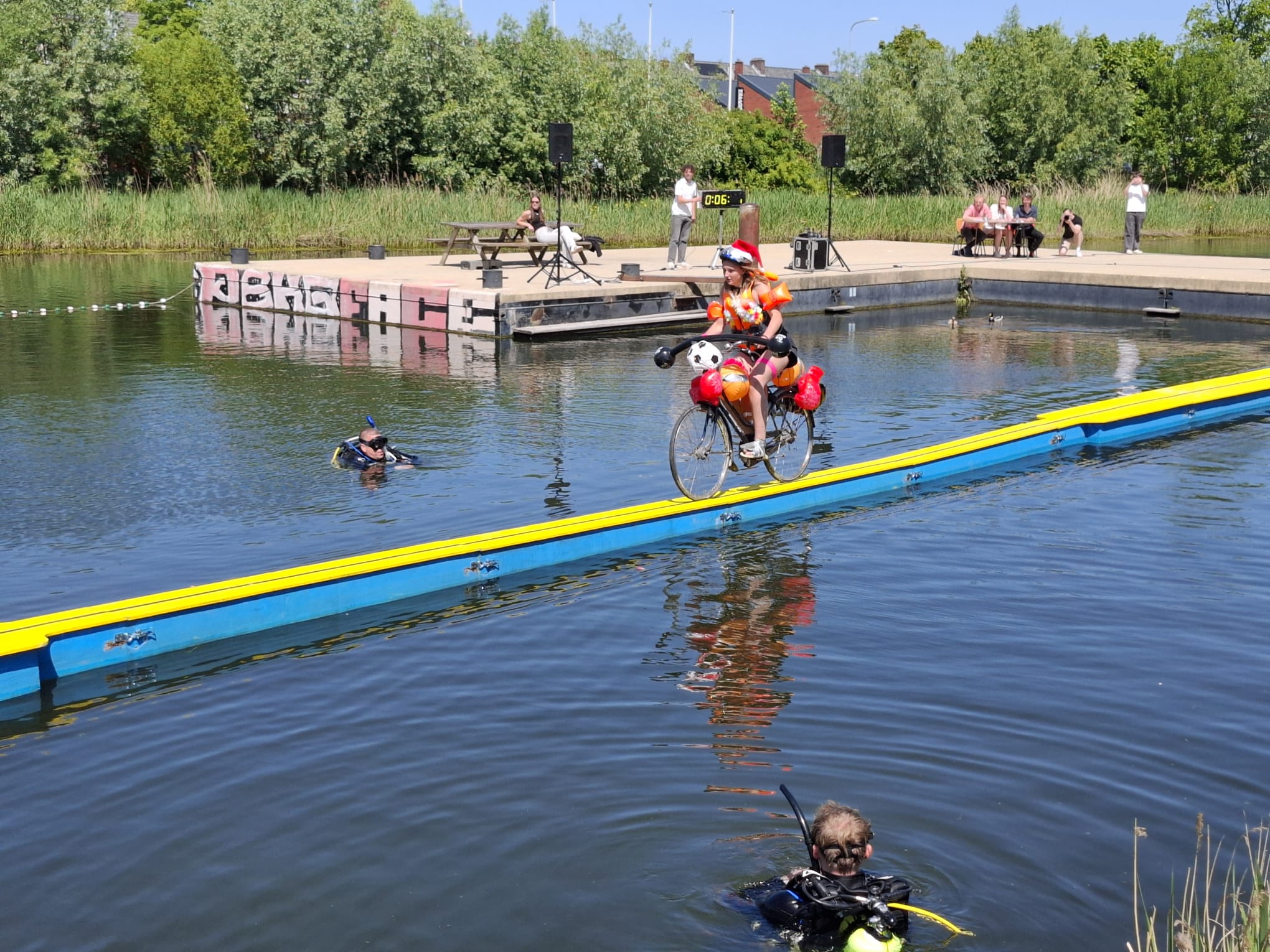 Tussen 13.00 en 16.00 uur konden deelnemers aan de start verschijnen. Het programma ‘Te Land, Ter Zee en in de Lucht’ was van 1973 tot 2011 op televisie te zien. Het bestond uit verschillende onderdelen zoals ‘Tobbedansen’ en ‘Hoog en Droog’. Zaterdag ging het om het onderdeel ‘Fiets ‘m d’r in’, waarbij een deelnemer zo snel mogelijk via een smalle balk aan de overkant moet zien te komen. “Er hadden zich vooraf dertig deelnemers opgegeven. Maar gaandeweg de dag kwamen er ook nog deelnemers bij. Dus uiteindelijk was er veel animo, waarbij het geweldig was om te zien hoe men via tandems zo snel mogelijk aan de overkant probeerde te komen.”