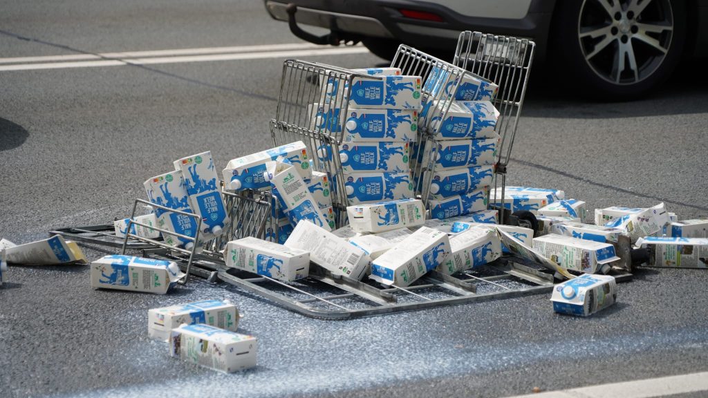 “De chauffeur was onderweg van Paddepoel richting Reitdiep”, vertelt nieuwsfotograaf Patrick Wind van 112groningen.nl. “Door nog onbekende oorzaak viel er lading uit de vrachtwagen. Het gaat om levensmiddelen. Behalve pakken melk zie ik ook fruit op de weg liggen. Verschillende pakken melk zijn kapot geraakt.” Er raakte niemand gewond.