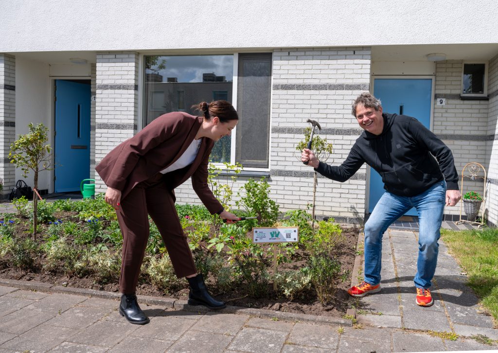 Wethouder Mirjam Wijnja plantte donderdag het eerste groen in de voortuin van een bewoner van de wijk Hoornse Meer. “We moeten ons aanpassen aan het veranderende klimaat en het afnemen van de biodiversiteit,” aldus Wijnja. “Vergroening speelt daarin een sleutelrol.”