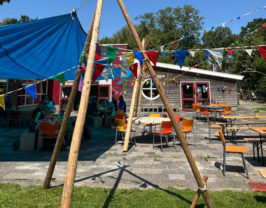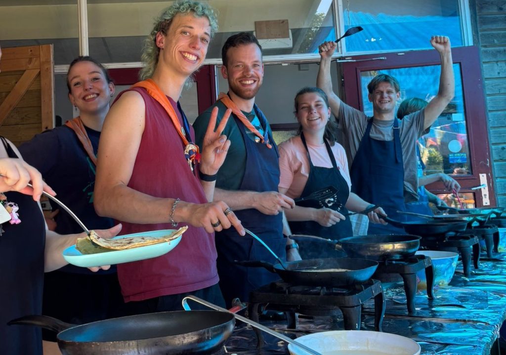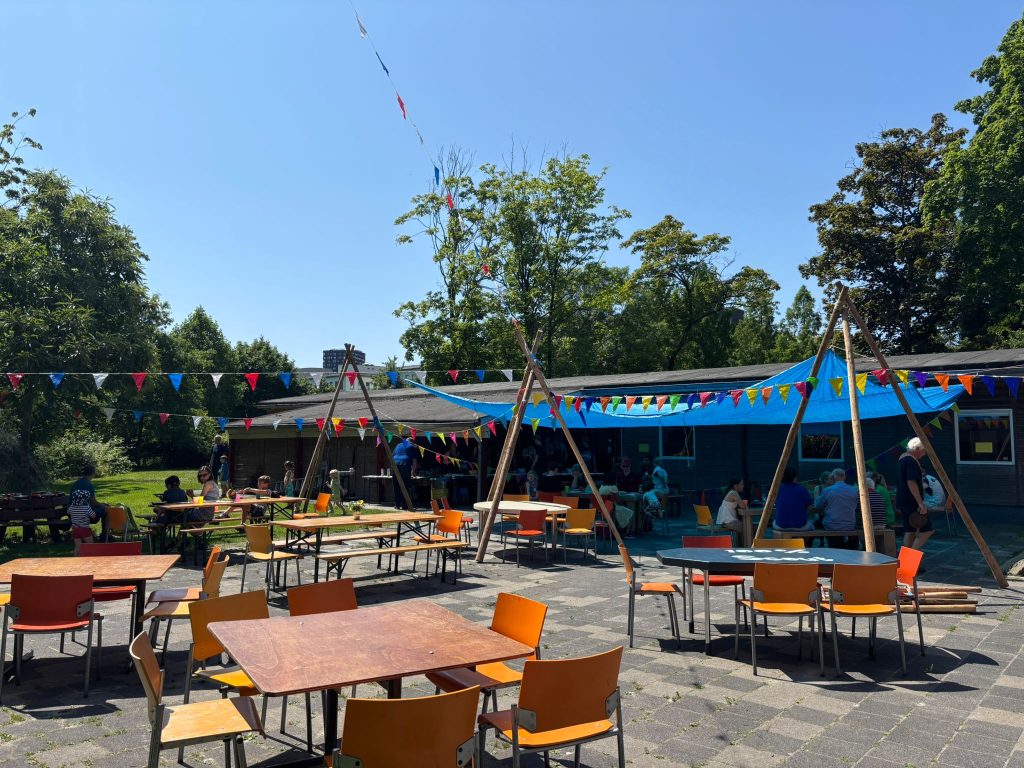 “We hebben het heel feestelijk ingericht. Stoelen en tafels staan buiten en we hebben vlaggetjes opgehangen. Omdat het vandaag flink warm wordt, hebben we ook tentzeil gespannen. Dat hebben we op z’n scoutings gedaan. Daardoor kun je in de schaduw van je pannenkoek genieten. En iedereen is vandaag welkom. Of je nu jong bent of oud, kom gerust bij ons langs. Ook voor mensen die slecht ter been zijn, is het terrein prima toegankelijk.”
