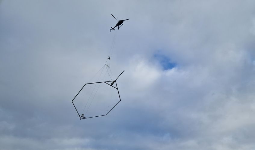 Boven Groningen is vanaf maandag zo nu en dan een bijzondere helikopter te zien. Onder het toestel hangt een groot zeshoekig apparaat. Maar een overvluchten van het gevaarte zijn geen reden tot zorg: het vreemde tafereel maakt deel uit van een bodemonderzoek.
