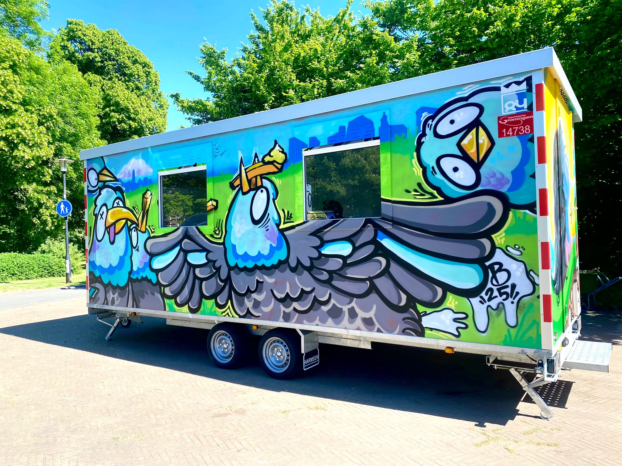 Een groep graffitikunstenaars is deze periode druk bezig om dertien gloednieuwe schaftketen van de gemeente te verfraaien met graffitikunst. Eén van hen is kunstenaar Quinten van Duuren uit Ten Boer.