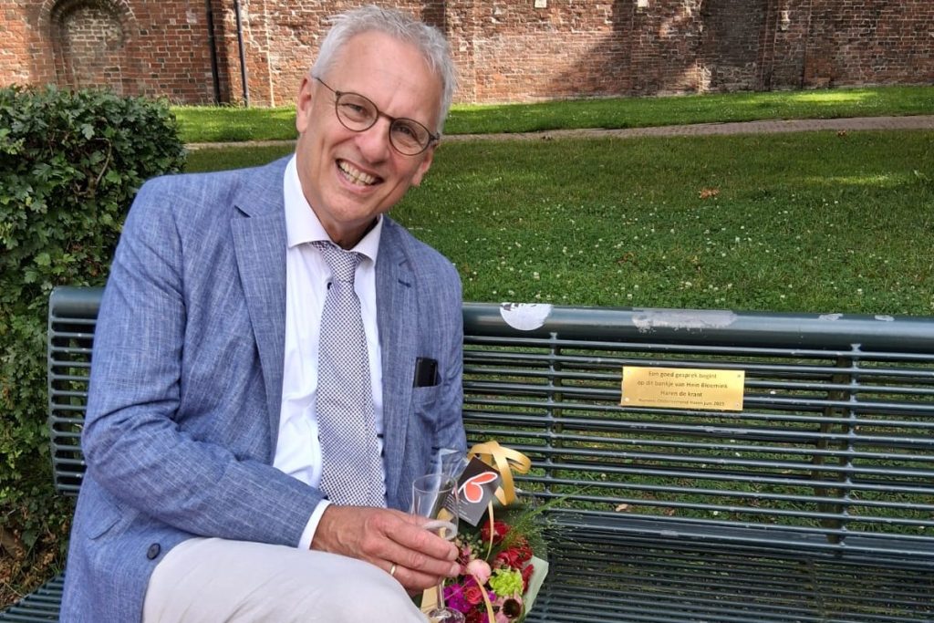 Ondernemers van Haren hebben vrijdagmiddag het bankje, waar Hein Bloemink elke maand iemand interviewt, aan hem aangeboden. Dit gebeurde ter ere van het dertigjarig bestaan van Haren de Krant.