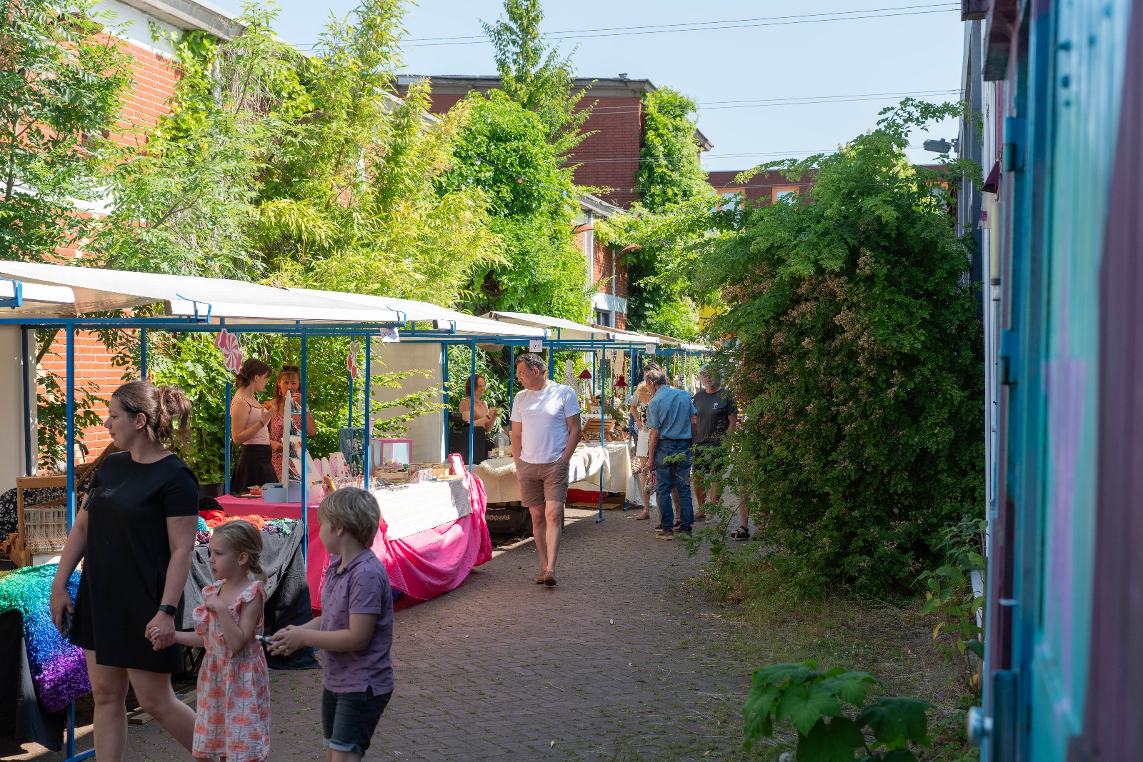 “Het vond vandaag plaats op het binnenterrein van Het Werk in de wijk. Daar stonden verschillende kraampjes waar kunstenaars werken zoals schilderijen, beelden en keramiek konden presenteren en verkopen. Het programma werd aangevuld met ‘open huizen’. In de omgeving van Het Werk bevinden zich allerlei creatieve maakplekken. Daar konden mensen naar binnenlopen om een kijkje te komen nemen.”