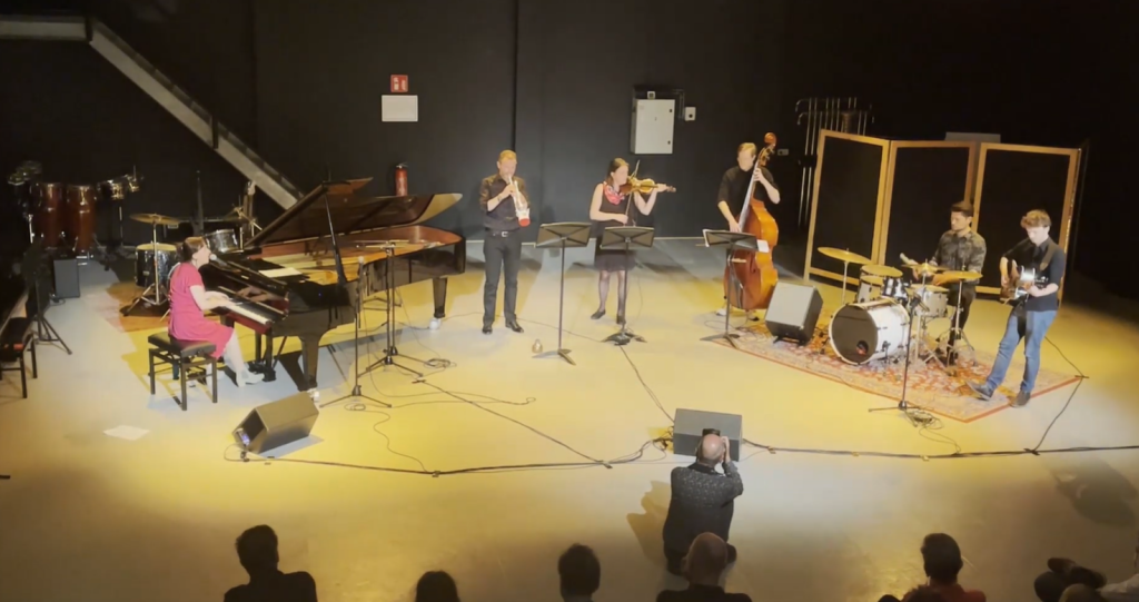 De band bestaat uit zes personen waarbij de muzikale bezetting bestaat uit piano, trompet, viool, contrabas, drum en slagwerk. Die combinatie tussen strijkinstrumenten en koperwerk lijkt me best wel een uitdaging…