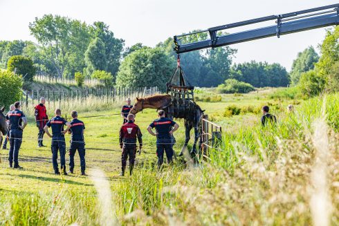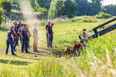 Waarschijnlijk zocht het paard verkoeling in de sloot. “In het weiland bevonden zich meer paarden. Zij vonden de reddingsactie maar wat interessant.” De fotograaf vertelt dat het bewuste dier niet gewond is geraakt.