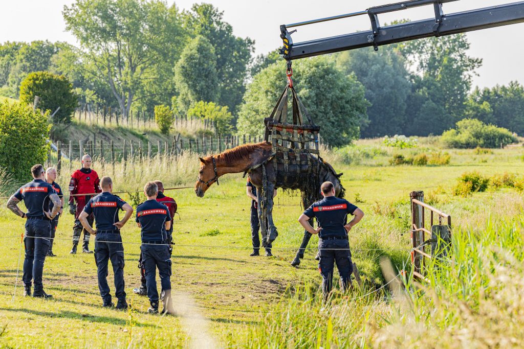 De melding van een dier in problemen kwam rond 18:30 uur bij de hulpdiensten binnen. Aanvankelijk werd er een tankautospuit opgeroepen, maar al snel werd duidelijk dat er meer hulp nodig was. Daarop werden ook de duikers en de grote hulpverleningswagen naar de locatie gestuurd. “Duikers zijn de sloot ingegaan en hebben een veetakel aangebracht”, vertelt Ten Cate. “In dit geval gaat het om een stevig net. Met behulp van de kraan, die zich op de hulpverleningswagen bevindt, is het paard uit de sloot getakeld.”