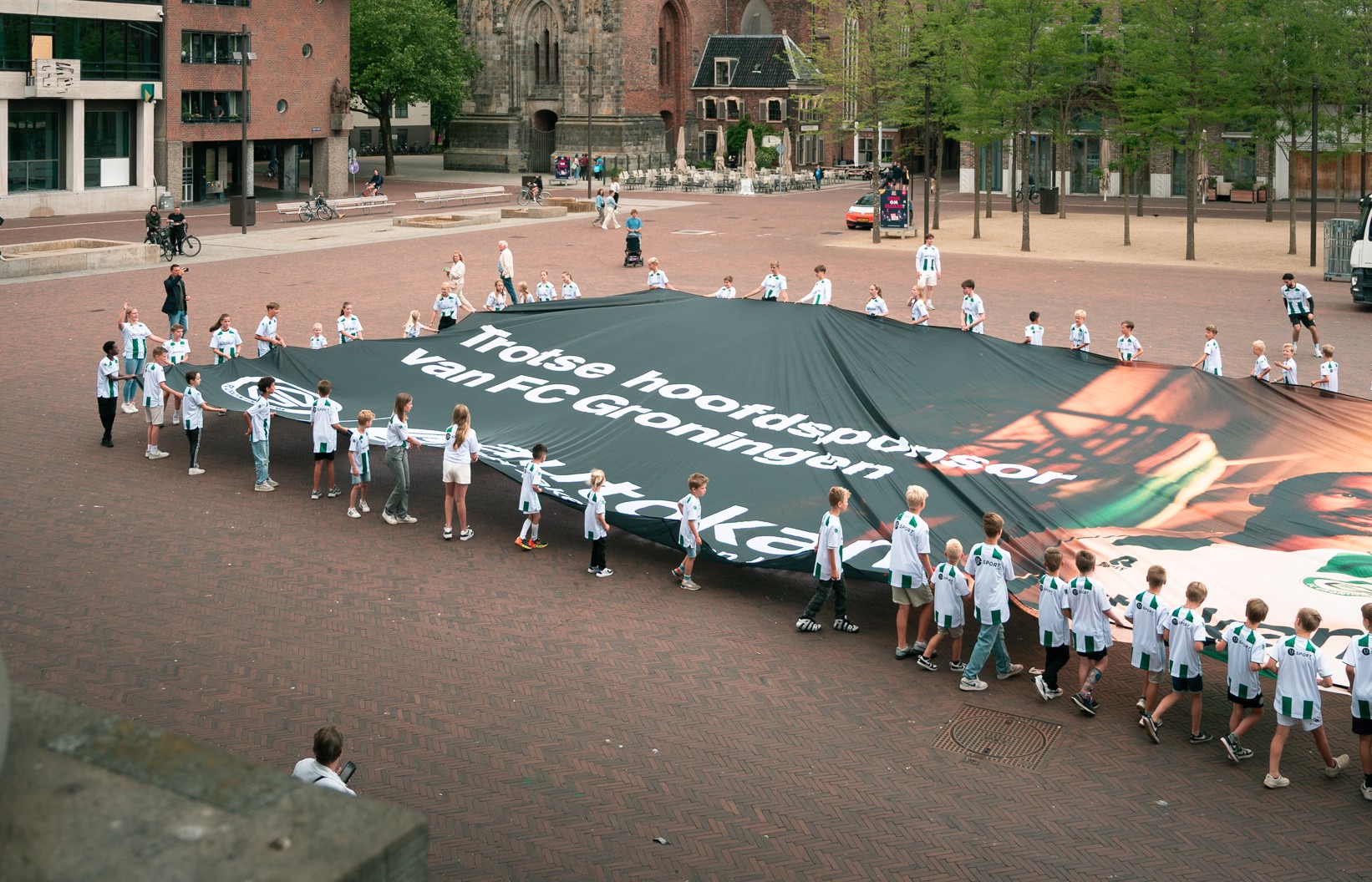 “We zijn inderdaad gaan nadenken: wat kunnen we nu doen? We hebben daarop een vraag uitgezet bij diverse voetbalverenigingen: zijn er ook kinderen die ons willen helpen? Binnen een half uur hadden zich al vijftig kinderen aangemeld, en uiteindelijk hebben we zo’n zeventig tot tachtig kinderen kunnen verwelkomen. Zij hebben vandaag meegedaan aan de ludieke actie waarbij zij het FC Groningen-doek ceremonieel hebben laten wapperen.”