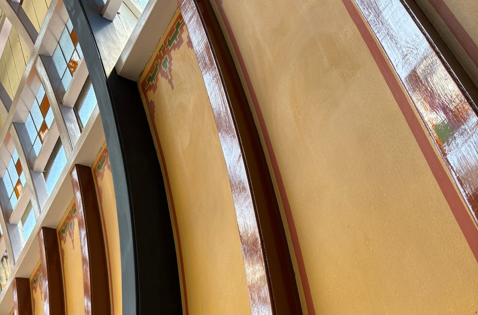“Absoluut. Maar toevallig was één van de nissen bij het pleisteren gespaard gebleven. Door het vochtig te maken, konden we de lijnen van het oorspronkelijke schilderwerk zien en hebben we de decoraties kunnen achterhalen. Daarnaast was er nog een geluk. Vlak na de bouw van het gebouw is er een foto gemaakt. Ook daar hebben we belangrijke informatie uit kunnen halen om de schilderingen in oude staat terug te brengen.”