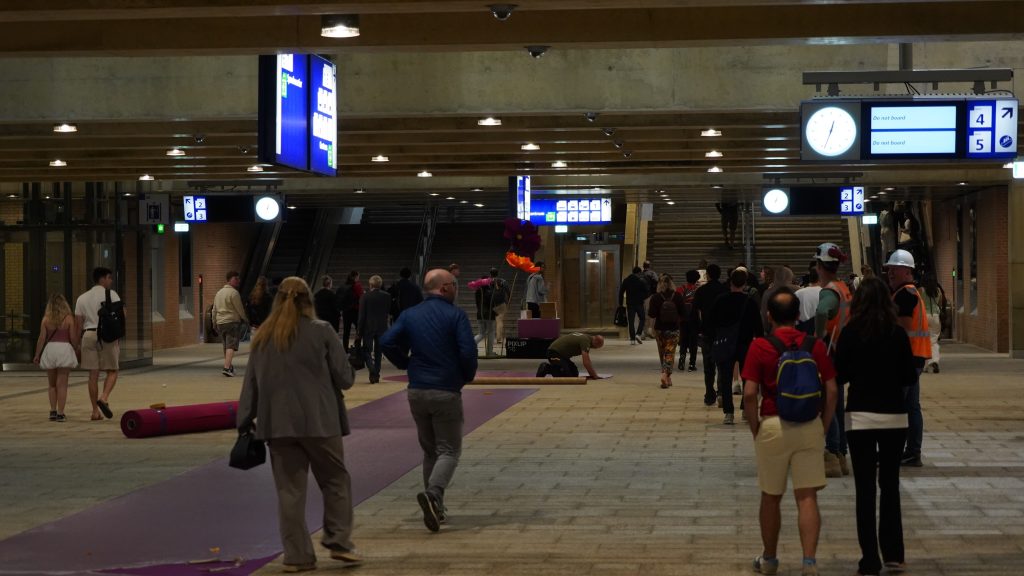De brandweer is in actie gekomen om de persoon uit de lift te bevrijden. De persoon die vastzat, was bezig met het opzetten van tijdelijke bankjes voor de openingsceremonie van het Hoofdstation die zondagochtend plaatsvindt