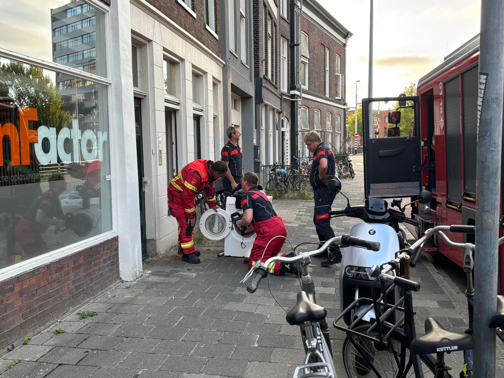 “Na aankomst hebben we een controle gedaan. In de wasmachine bleek zich nog wel een vuurhaard te bevinden. Deze hebben we onder controle gebracht. Vervolgens hebben we het apparaat buiten neergezet.”