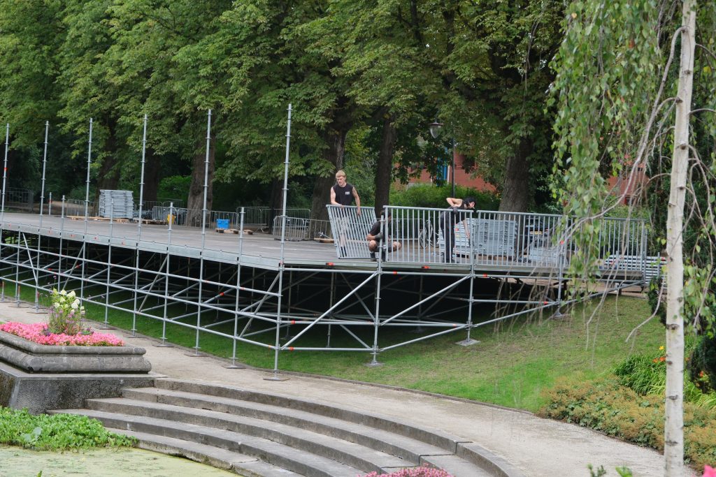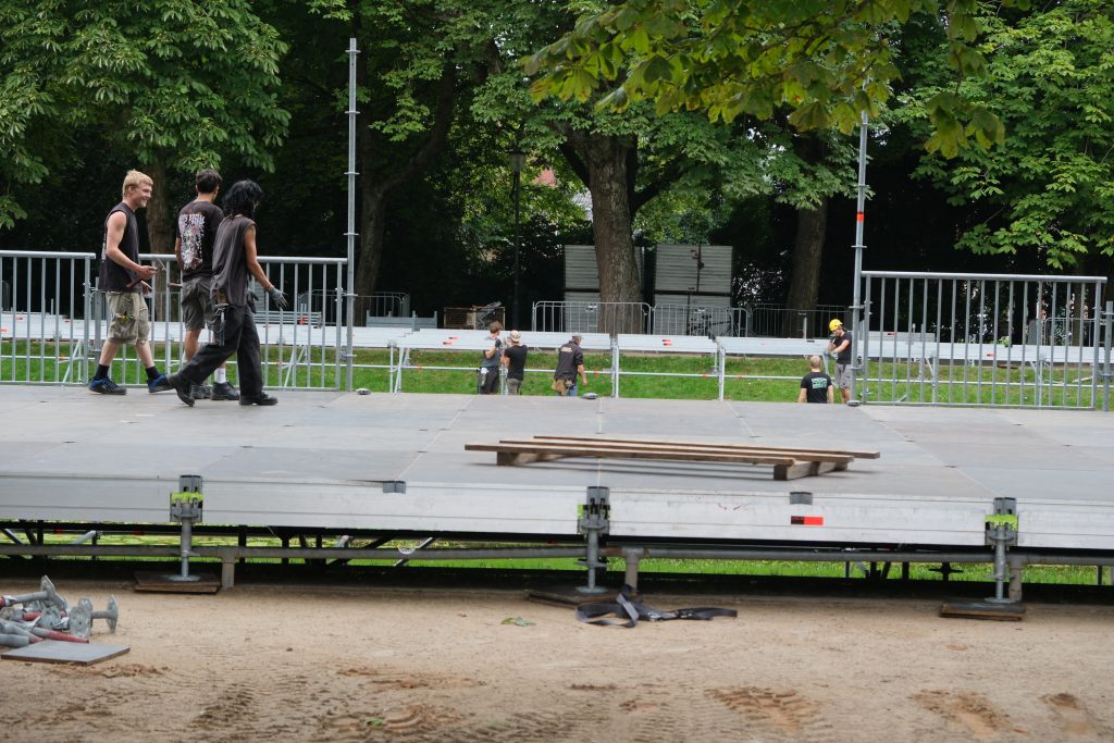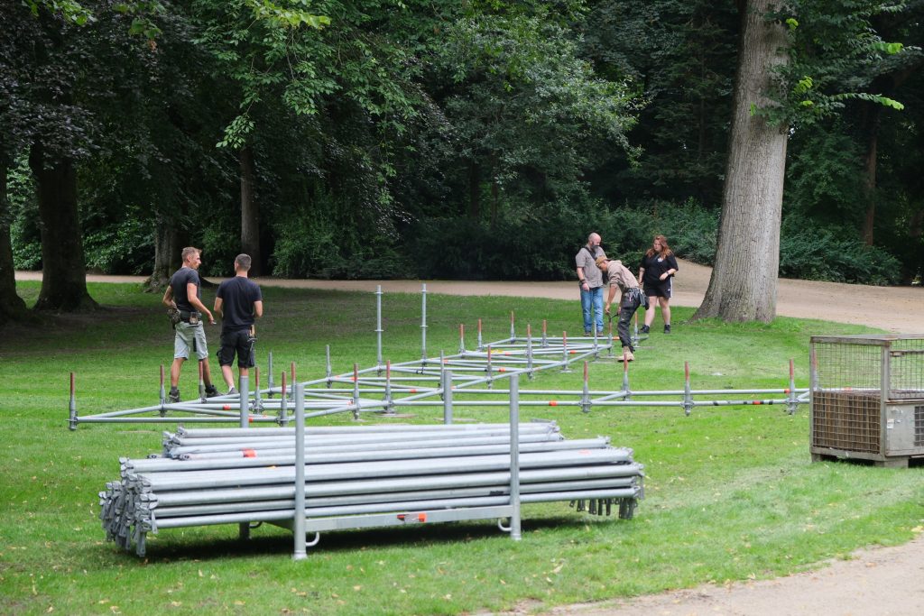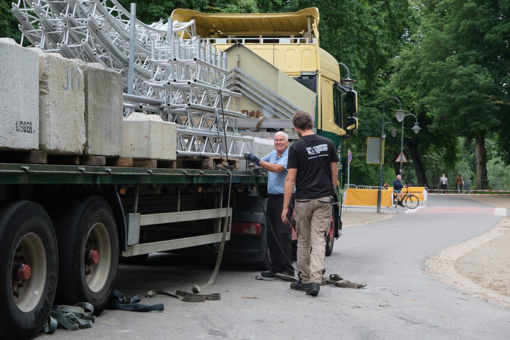 “We zijn vanochtend om acht uur begonnen”, zegt Nienke de Vries van Noorderzon. “Tot nu toe gaat alles best hard, best snel en eigenlijk op rolletjes.” De opbouw gebeurt in lagen, legt De Vries uit: “Je moet als eerste de eerste laag klaar hebben voordat je aan de volgende kunt beginnen. Dus we bouwen de grote dingen als eerst. Daarna kunnen we techniek gaan bouwen. Dan kunnen we de decors inzetten.”