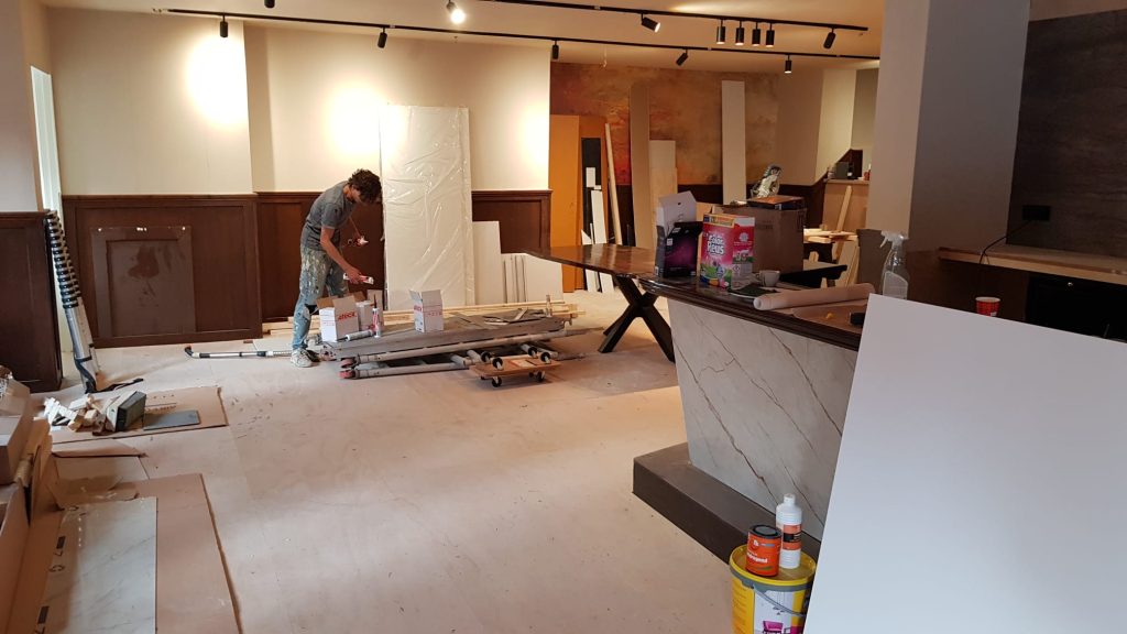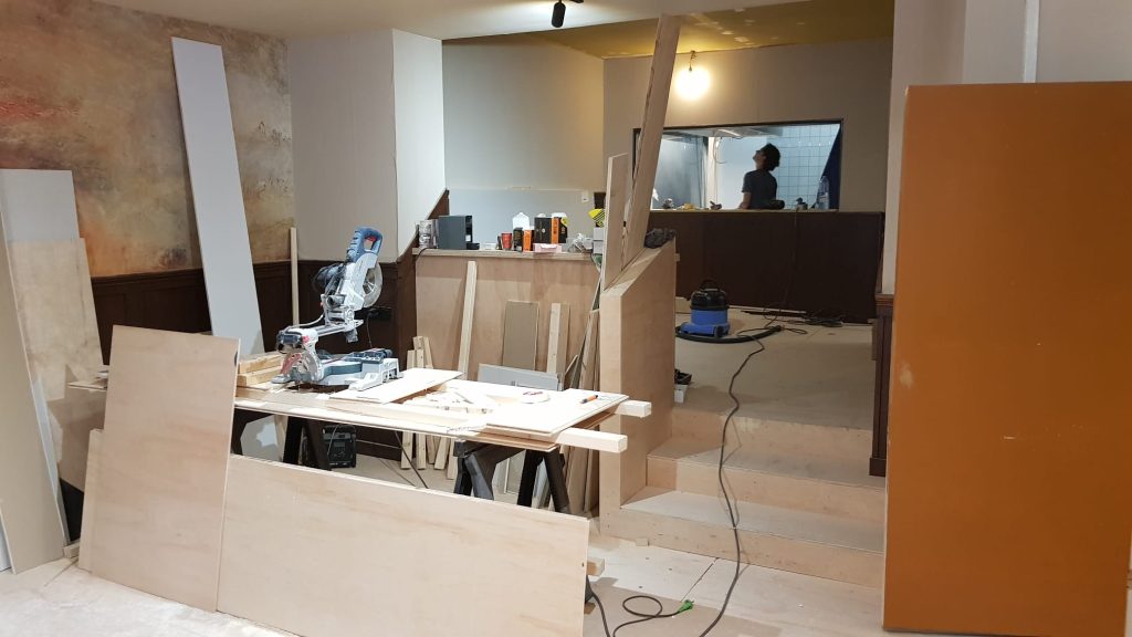 In het gebouw wordt volop gewerkt. “We hebben eigenlijk het hele pand gestript,” legt Van Lieren uit. “Ook de keuken hebben we eruit gehaald. We bouwen het van A tot Z helemaal opnieuw op. De bar is wel ongeveer hetzelfde gebleven. Er stond hier al een hele mooie bar, maar die heeft nu marmeren panelen gekregen en staat in de bootlak, waardoor hij weer helemaal strak is. En als we hier naar achteren lopen, komen we bij de open keuken. Vlak voor de keuken komt een verhoging waar straks een grote tafel komt te staan. Aan die tafel kunnen grote gezelschappen zitten, die dan van dichtbij de actie in de keuken kunnen meemaken.”