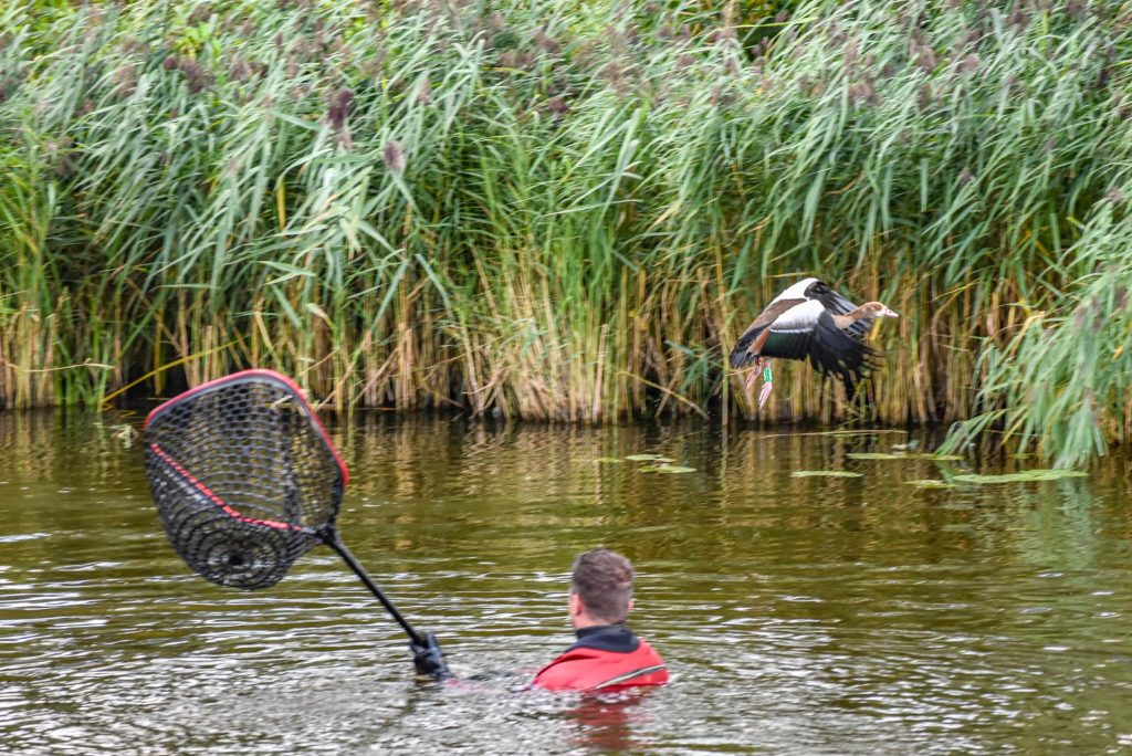 De melding van een dier in problemen kwam rond 16.40 uur bij de hulpdiensten binnen. “Behalve de dierenambulance kwamen ook de duikers van de brandweer naar de locatie”, vertelt Weening. “Op de locatie troffen ze een nijlgans aan, die verstrikt is geraakt in visdraad. Daardoor kan het dier zich niet goed bewegen. Samen met medewerkers van de Dierenambulance Groningen zijn er meerdere pogingen gedaan om het dier te vangen. Daarbij gingen er ook duikers te water. Maar de pogingen waren tevergeefs. De nijlgans liet zich niet vangen omdat het dier nog teveel energie heeft.”