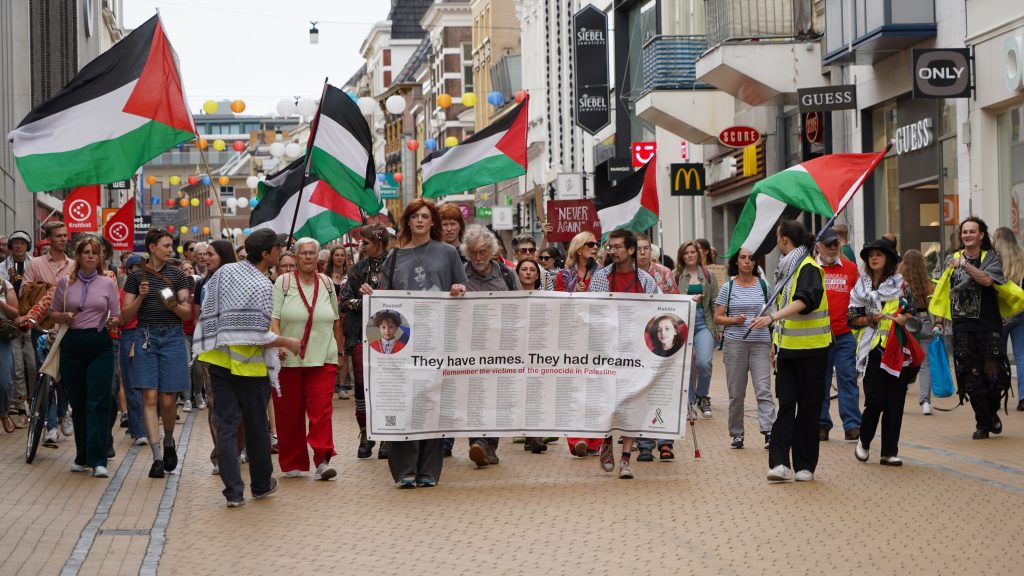 Donderdagavond trokken een paar honderd Pro-palestina demonstranten door de stad. De demonstratie begon op de Grote Markt en ging lopend richting het Hoofdstation waar een sit-it plaatsvindt.