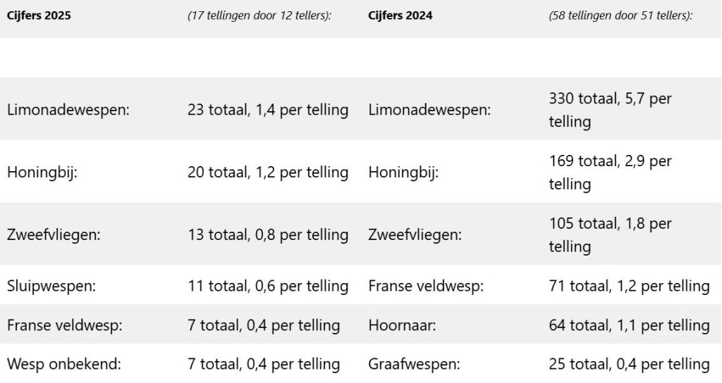 Vooral bij de limonadewesp en honingbij is de daling groot. Waar vorig jaar nog gemiddeld bijna zes limonadewespen per telling werden gezien, waren dat er dit jaar slechts anderhalf. Ook bij de honingbij is het verschil duidelijk.