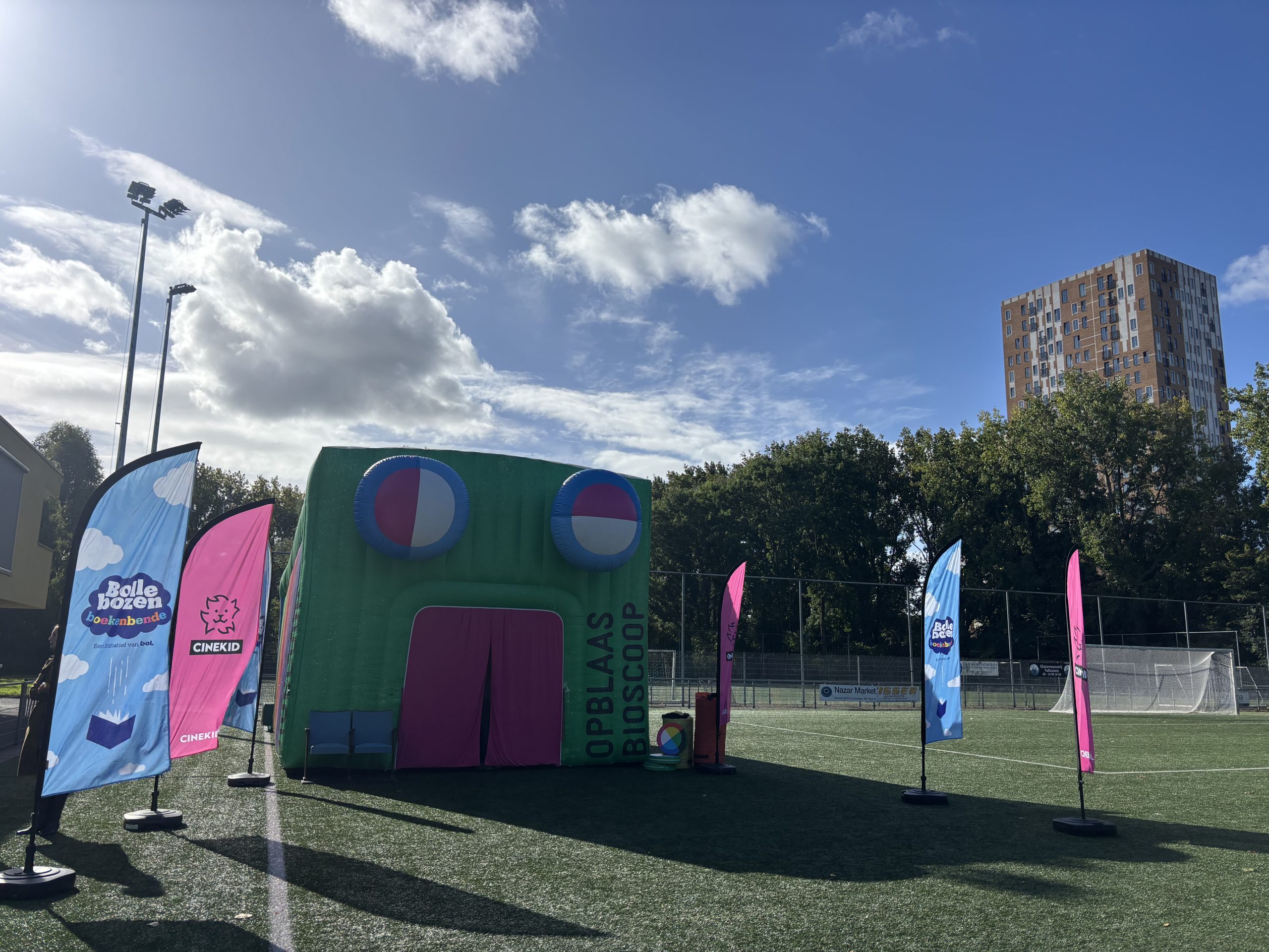 Een kleurrijke opblaasbioscoop sierde op maandag het schoolplein van basisschool De Pendinghe in Groningen. De bijzondere bioscoop is onderdeel van een landelijke tour van Bollebozen en Cinekid, die kinderen spelenderwijs laat kennismaken met verhalen, film én leesplezier.
