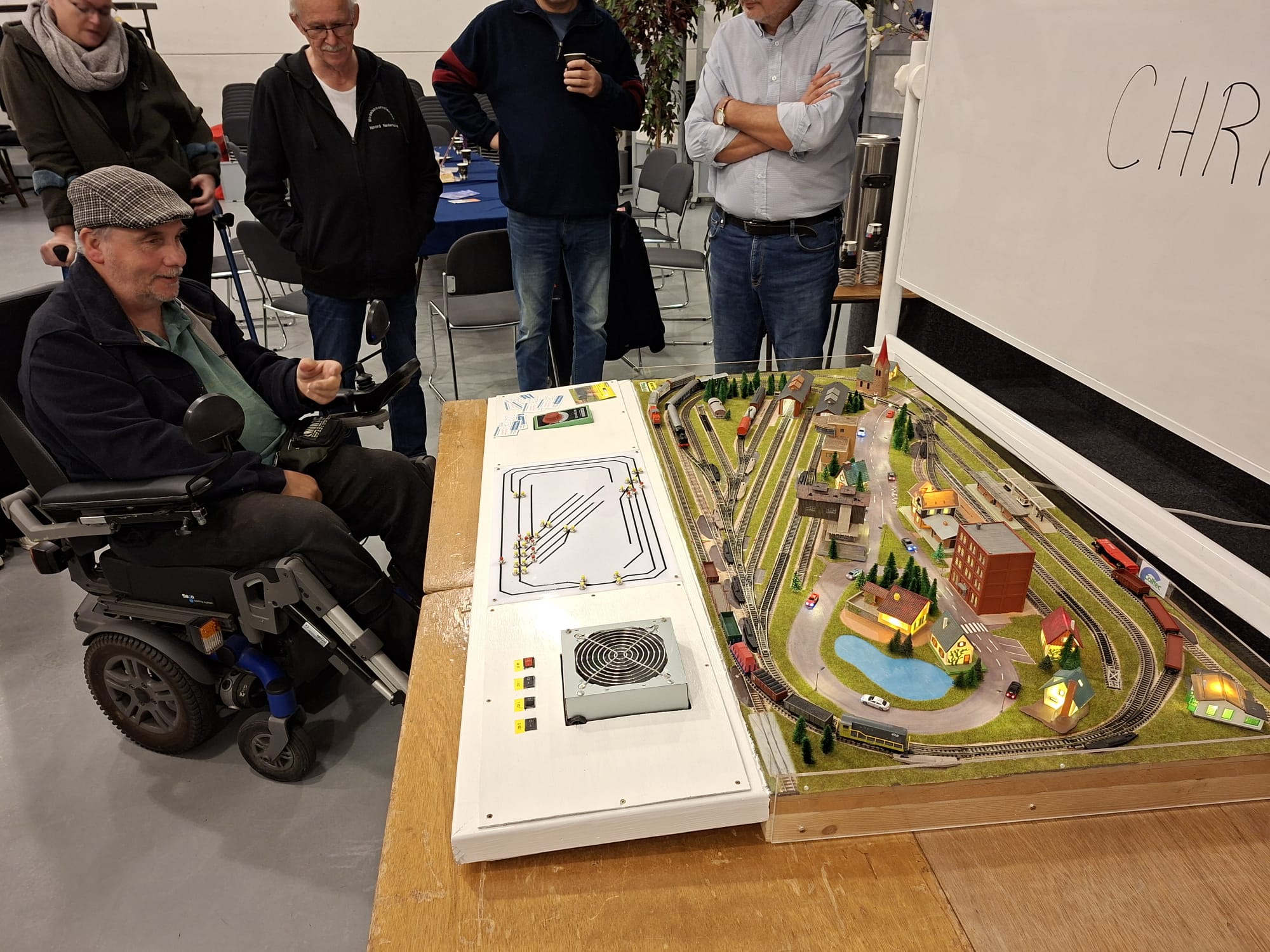 “Chris krijgt een baan waarmee er heel veel mogelijkheden zijn. Ik vertelde al dat hij zich in een rolstoel voortbeweegt. Hij is halfzijdig verlamd en heeft daardoor niet de mogelijkheid om te reiken. De bediening van de baan moest dus zo gemaakt worden dat hij er makkelijk bij kan. Vanuit zijn stoel kan hij de snelheid van de treinen bepalen en kan hij ook de wissels omzetten. De baan omvat een klein stadje, waarbij er een rangeerterrein is, er is een station waar treinen automatisch stoppen, en waarmee met een druk op de knop de trein weer verder gaat rijden. In de huisjes branden lampjes en dat geldt ook voor de auto’s die op straat staan. Zij hebben brandende koplampen.”