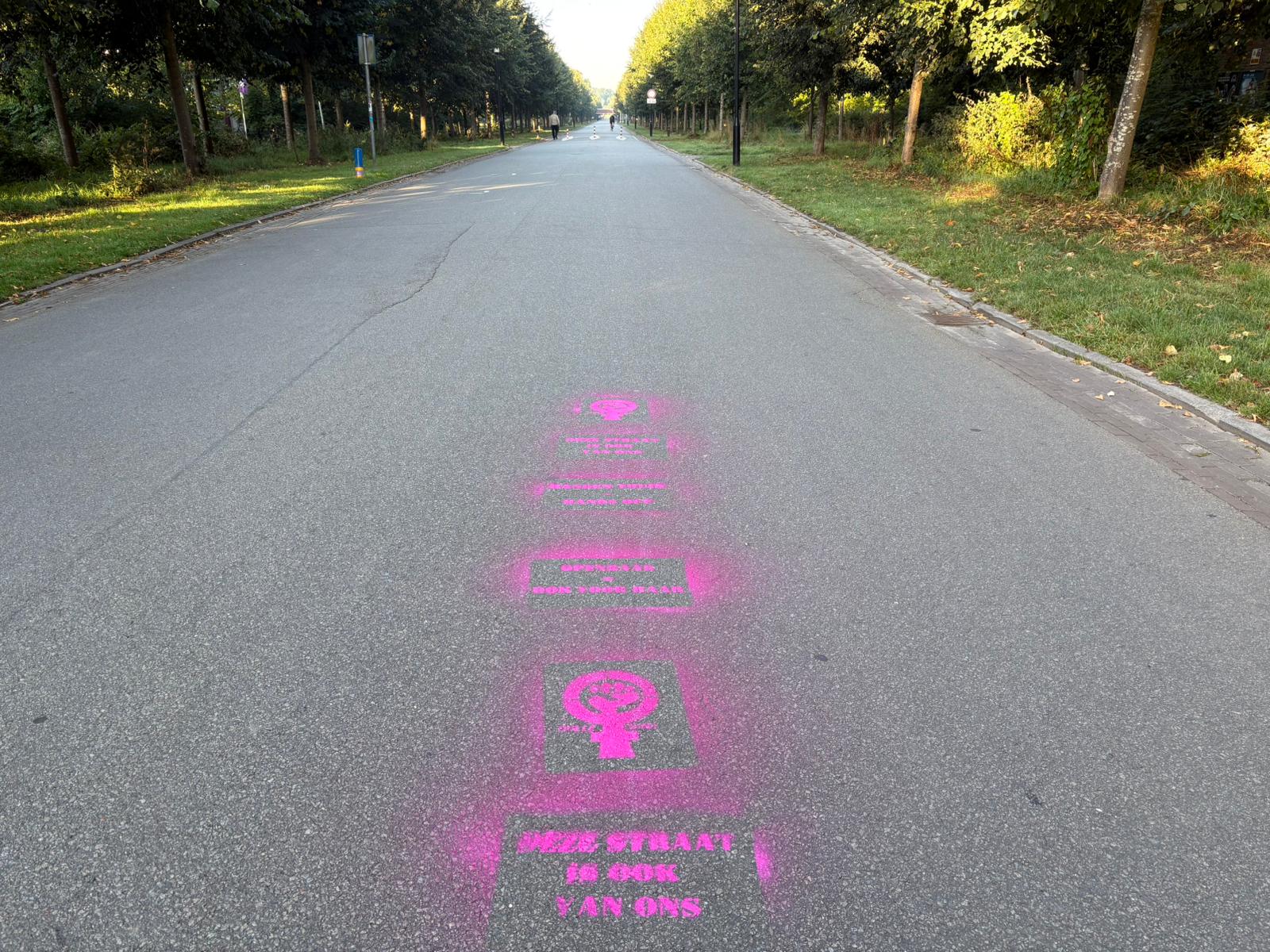 “Daar hebben we zeker over nagedacht. Dit weekend vindt het Hullabaloo Festival plaats, een festival dat veel jongeren trekt. Op de looproute naar het festival hebben we teksten aangebracht zoals ‘deze straat is ook van ons’ en ‘openbaar = ook voor haar’. We hopen dat dit leidt tot bewustwording en dat mensen gaan nadenken over wat normaal is en wat absoluut niet.”
