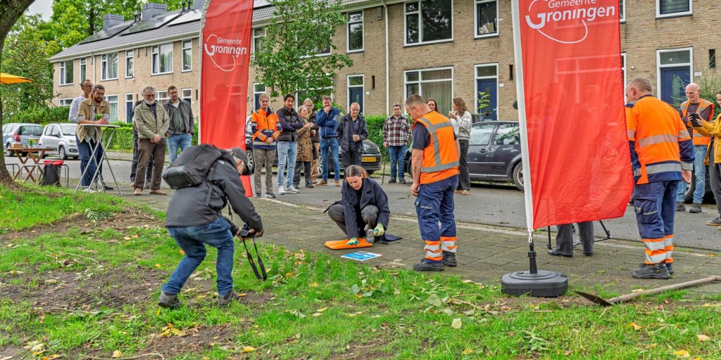 Aan de Zilverlaan in Vinkhuizen is donderdagochtend de eerste ‘klimaattegel’ gelegd door wethouder Mirjam Wijnja.