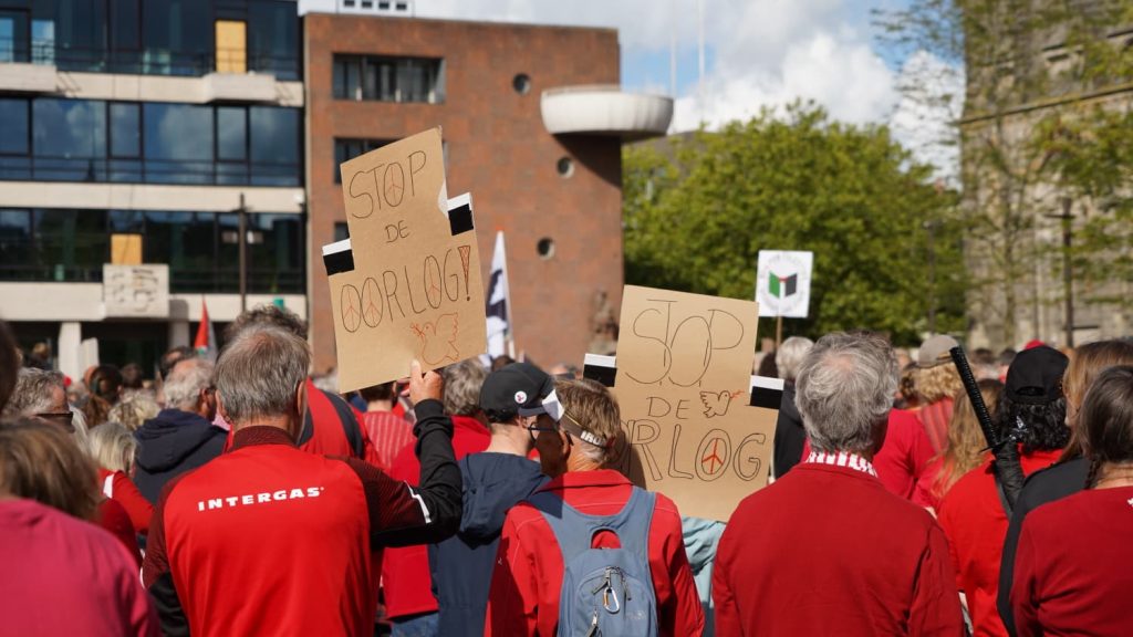 Honderden mensen, gekleed in het rood, hebben zondagmiddag deelgenomen aan de protestactie ‘Rode Lijn’ die op de Grote Markt plaatsvond. Het protest richtte zich tegen de passieve houding van regeringen ten aanzien van de oorlog in Gaza en de Palestijnse humanitaire crisis.