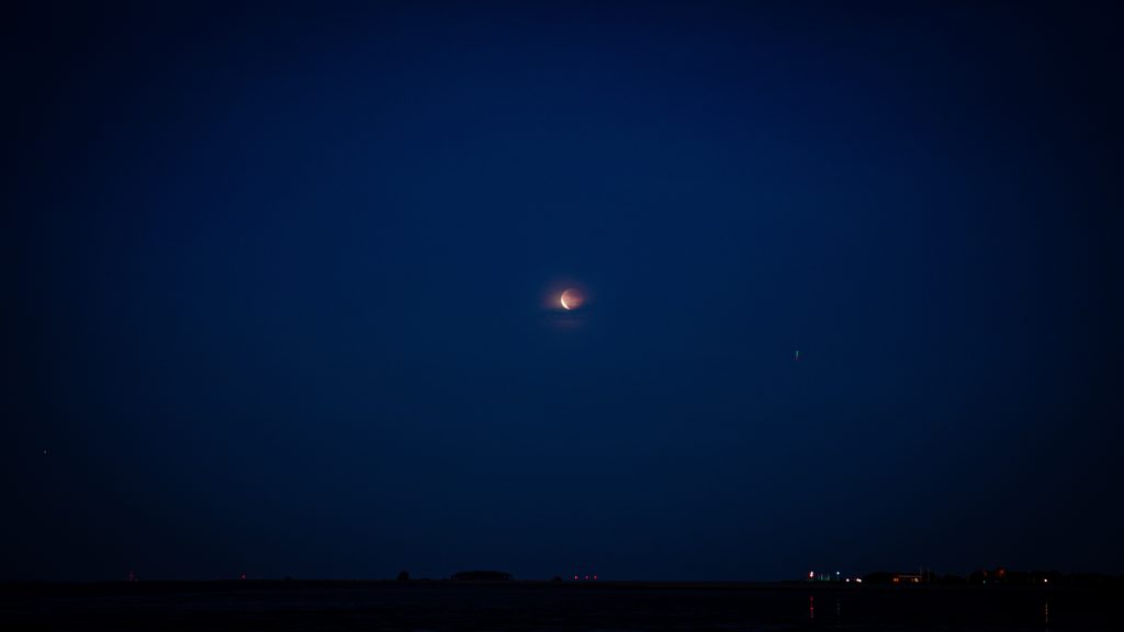 “De verduistering begon rond 20.15 uur. Dat is het moment dat de maan opkomt in het oosten. Dus in het westen heb je de zon die ondergaat, en aan de oostkant heb je de maansverduistering. Hoe breng je dat in beeld terwijl het nog niet volledig donker is? Ik heb gezocht naar een locatie waar ik vrij zicht had op de oostelijke hemel. Ik koos ervoor om naar het voormalige dorpje Oterdum te rijden. Dit dorpje is in de jaren zeventig volledig afgebroken vanwege de verbreding van de zeedijk van de Eemsmonding, die op deltahoogte moest worden gebracht. In de buurt van dit dorpje heb je de Oterdummer Pier. Op deze zeedijk heb je een mooi uitzicht.”