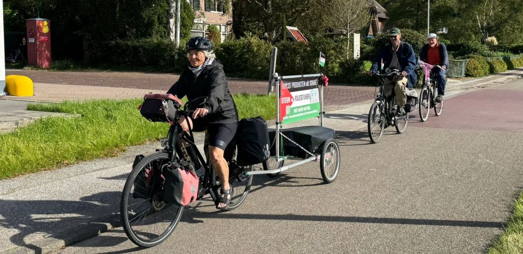 Aan Maria’s fiets hangt een kar met banners. Onderweg deelt ze flyers en boekjes uit om mensen te informeren: “Ik hoop dat er in elke stad een paar mensen aan het denken worden gezet. Dat ze zich gaan verdiepen in de geschiedenis, die al lang voor 7 oktober begon.”