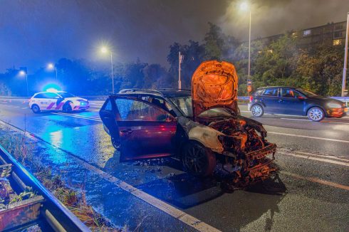 Een personenauto is dinsdagavond op de westelijke ringweg zwaar beschadigd geraakt door brand, meldt nieuwsfotograaf Rick ten Cate van tencatefotografie.nl.