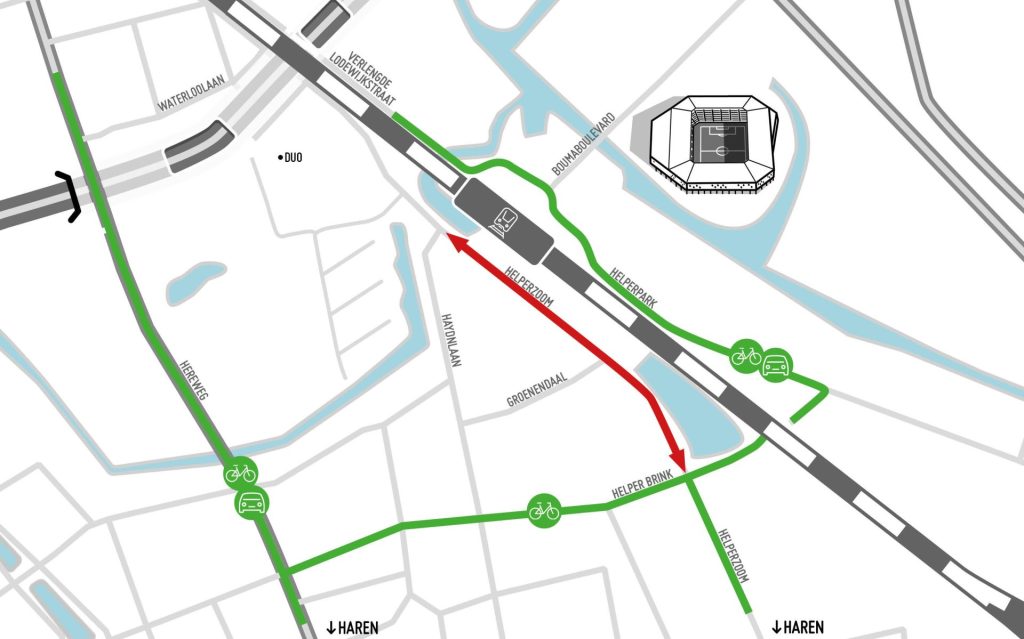 Fietsers die vanuit het zuiden komen, bijvoorbeeld uit de richting Haren, kunnen omrijden via de Helper Brink en de Hereweg of via de Helperzoomtunnel en de Verlengde Lodewijkstraat. Station Groningen Europapark blijft bereikbaar via de route door de Helperzoomtunnel.