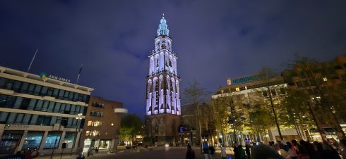 De installatie van de nieuwe verlichting is maandagavond rond half 8 ingeluid met het Gronings volkslied – gespeeld met de klokken van de Martinitoren – en een kleine licht show. Een uniek moment voor de Groninger.
