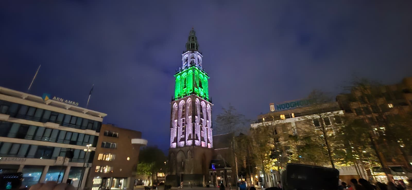 De installatie van de nieuwe verlichting is maandagavond rond half 8 ingeluid met het Gronings volkslied – gespeeld met de klokken van de Martinitoren – en een kleine licht show. Een uniek moment voor de Groninger.