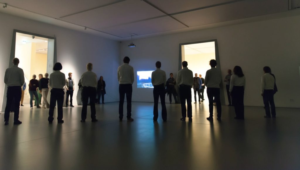 De groep voerde een stille performance uit in een zaal van de tentoonstelling It’s About Time. De deelnemers stonden in een rij en noemden één voor één musea in Nederland die al zijn gestopt met fossiele sponsoring. Daarmee wilden ze laten zien dat andere instellingen volgens hen verder zijn dan het Groninger Museum.