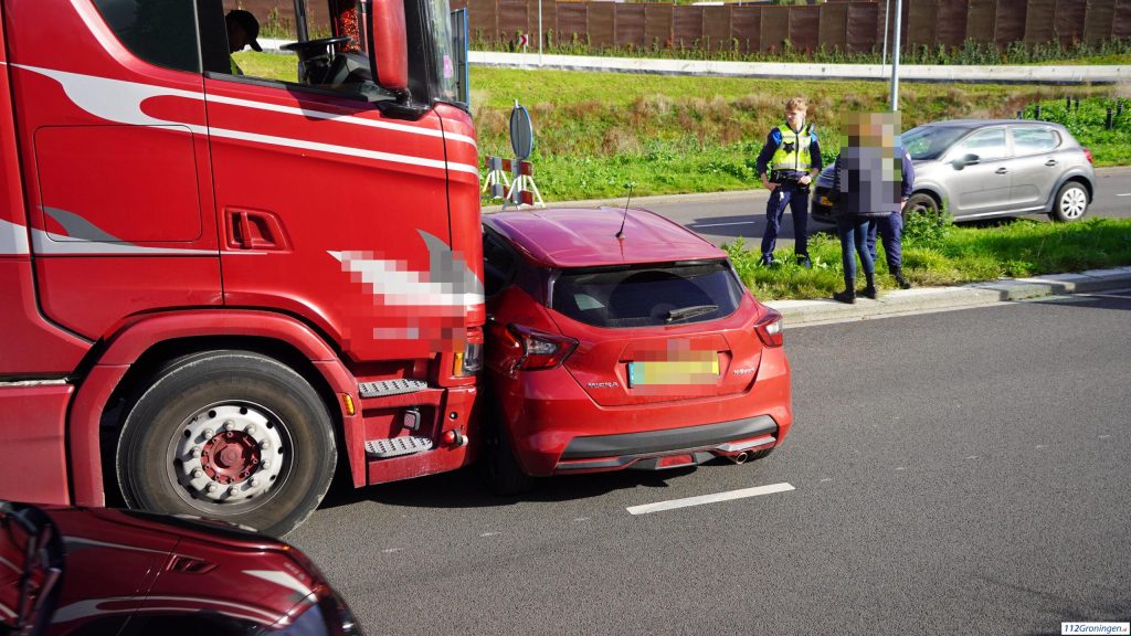 Een vrachtwagen en een personenauto zijn maandagmiddag met elkaar in botsing gekomen op de Brailleweg.