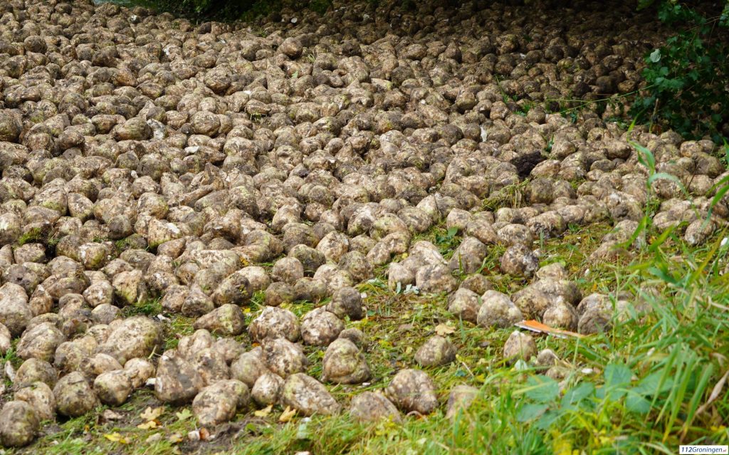 De klep van de trailer raakte los waardoor een grote lading bieten op het wegdek terecht kwam.