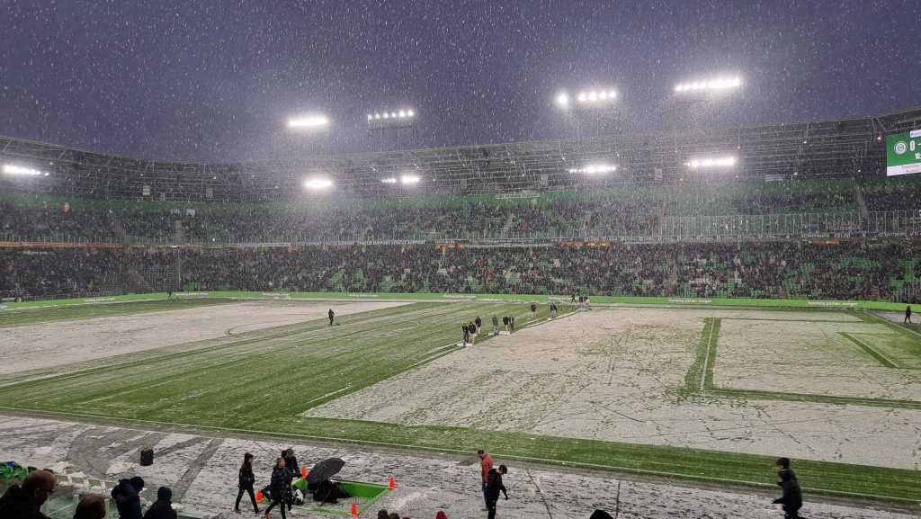 Op dat moment was het opnieuw flink gaan sneeuwen en tien minuten voor tijd legde Bos de wedstrijd voor de tweede keer stil. Wederom moest het veld sneeuwvrij gemaakt worden, al kwam de neerslag met dusdanige hoeveelheid uit de hemel, dat het schuiven met de kraan open was.