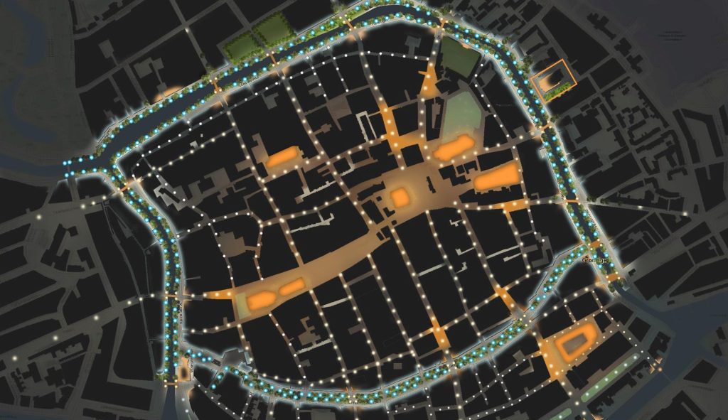 Lanen en singels rond de historische kern worden verlicht met masten van zes tot zeven meter hoog met moderne armaturen die zowel de rijbaan als trottoir en gevels verlichten. Bomen en gevels krijgen bovendien een lichtsluier.