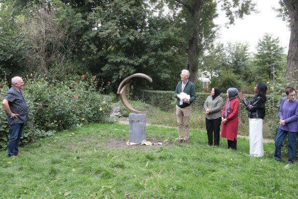 “Dat klopt. Met dank aan de gemeente. Het kunstwerk ‘Nieuw begin’ van Herman Bartelds uit Haren staat in onze tuin. Een prachtig beeld, dat heel erg past. Het is zo mooi omdat het van alle kanten heel verschillend is. Dat we ook kunst een plek wilden bieden, dat hadden we al opgenomen in het ontwerp. In het begin dachten we, we willen iets met een fontein. Maar dat bleek een heel gedoe te zijn. Onze Femme Dijkstra heeft daarop contact gezocht met de gemeente. En het kwam er op neer dat er een lijst met foto’s gedeeld werd met kunstwerken. Dat hebben we besproken en we hebben een keuze gemaakt. De gemeente heeft de sokkel van het kunstwerk hersteld en in september is het beeld geplaatst en onthuld. Het is echt een eyecatcher geworden.”