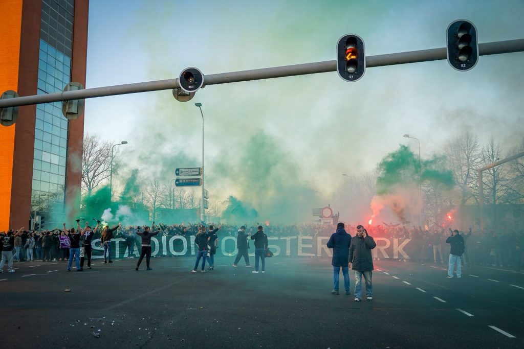 Tijdens de corteo klonk er luid gezang, werd vuurwerk afgestoken en voerden de fans een groot spandoek mee met de tekst ‘stadion Oosterpark’. Op de Oosterhavenbrug kwam er vanuit tegenovergestelde richting een ambulance met spoed aangereden. De supporters maakten voor het voertuig ruim baan, zo is te zien in onderstaande video.
