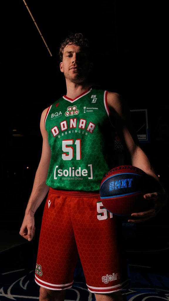 In het tenue is een subtiel watermerk verwerkt met een historische actiefoto uit de tijd dat Donar nog in T-shirts speelde. Over het hele tenue zijn de karakteristieke cirkels uit het oude clublogo zichtbaar, met op de voorkant van het shirt de naam ‘Donar Groningen’ in het oorspronkelijke lettertype. De kleuren rood, wit en groen verwijzen tevens naar de vlag van de stad Groningen.