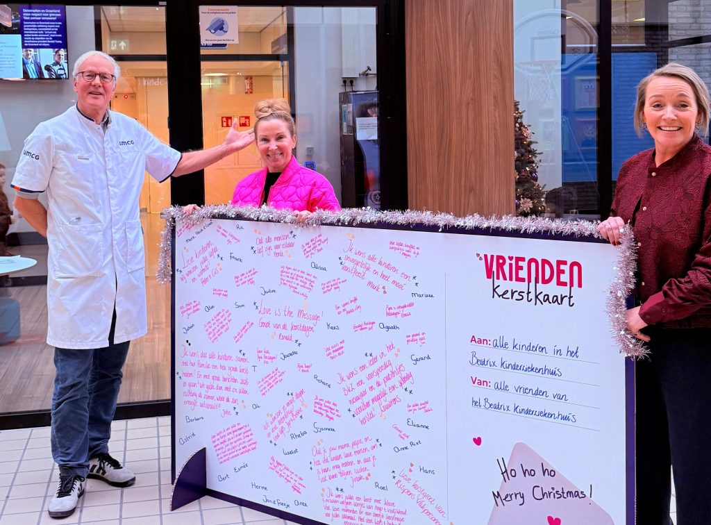 De levensgrote kerstkaart blijft tijdens de kerstdagen bij de poli staan, zodat kinderen de kerstwensen kunnen lezen. Met de kaart wil de Stichting Vrienden van het Beatrix Kinderziekenhuis aan de opgenomen kinderen laten zien dat niemand er tijdens de feestdagen alleen voor staat.