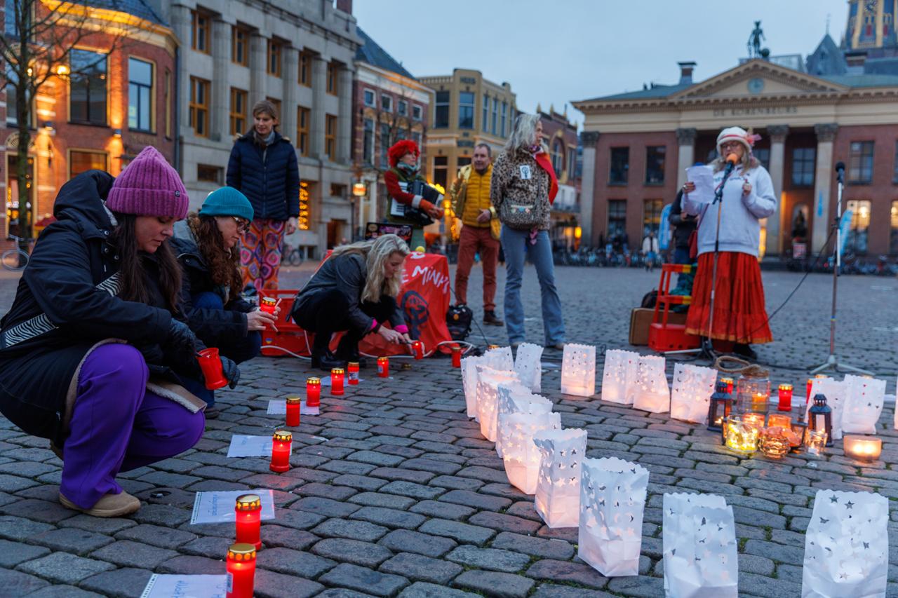 “Het was heel mooi”, vertelt Jorien Bakker van de Dolle Mina’s. “Het was precies dat waar we op hadden gehoopt. We hadden de lichtjes in een hartvorm neergezet. Alle namen van de vermoorde vrouwen hadden we een plek gegeven op de Vismarkt, waarmee we de slachtoffers van femicide eerden. Wij waren met een groep van ongeveer tien personen aanwezig, en al heel snel na het begin kwam er ook een groep Iraanse vrouwen bij ons staan. Tot ongeveer 18.00 uur hebben we op de Vismarkt gestaan, en het was een komen en gaan van mensen.”