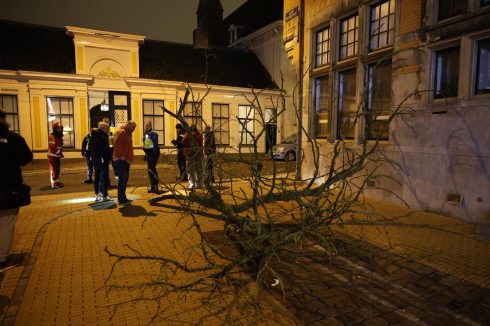 Verschillende woningen van het Pelstergasthuis aan de Kleine Pelsterstraat zijn zondagavond beschadigd geraakt. Op het middenterrein is een boom omgevallen, die deels op het gebouw terecht is gekomen.