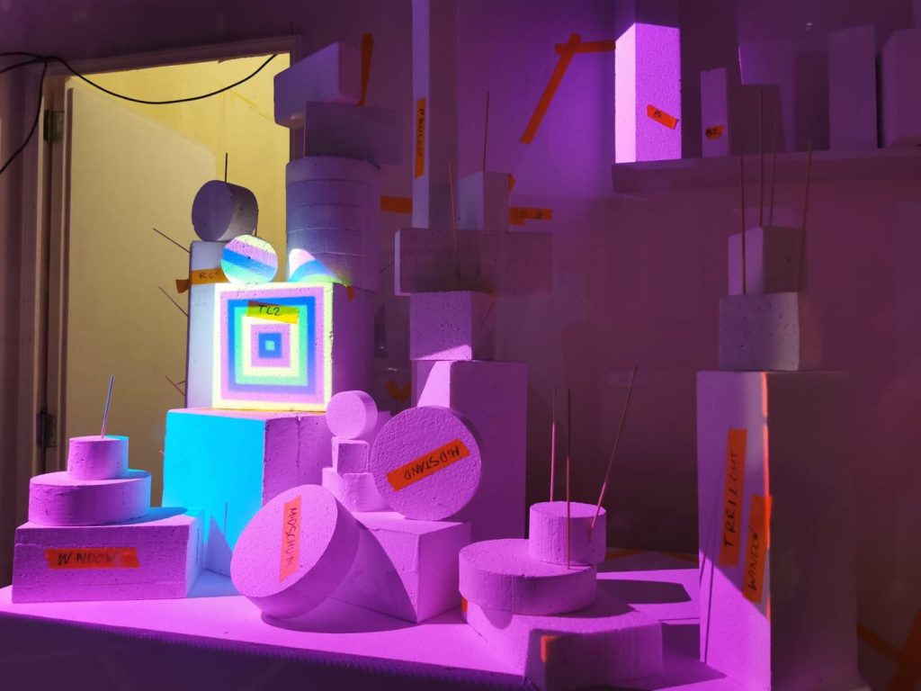 “Femke maakt video-installaties die reageren op de ruimte. Ze gebruikt lichte materialen zoals foamboard en gips om volumes te bouwen waarin de bezoeker zich visueel kan verliezen. Er worden beelden uit virtuele werelden en grafische patronen op de contouren van deze schermen geprojecteerd. Zo ontstaat een universum dat tegelijkertijd tastbaar en ongrijpbaar is.”