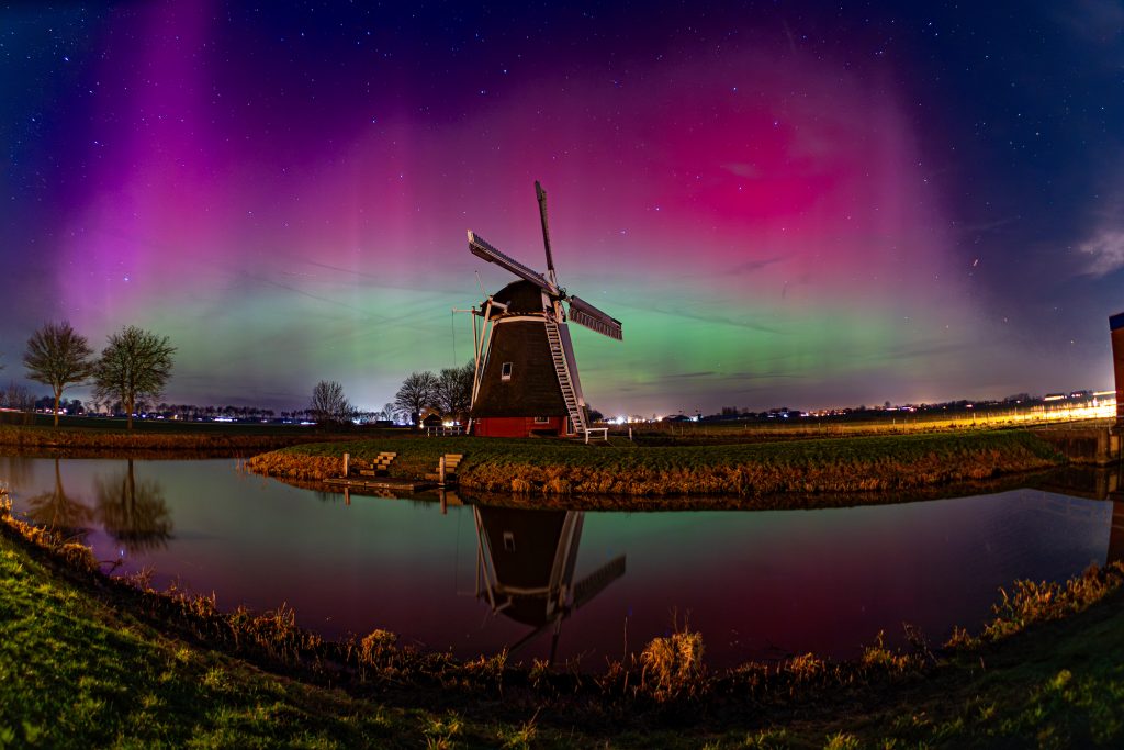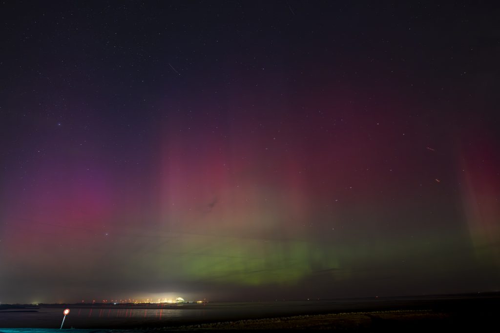 Dinsdagavond diende zich echter een nieuwe kans aan. “Ik heb verschillende apps waarmee ik kan zien hoe groot de kans is om het noorderlicht te bewonderen. In het begin van de avond gaf de Kp-index een 6 aan, maar later liep dit op richting de 8. Dat is een maat voor geomagnetische activiteit; hoe hoger de index, hoe groter de kans.” Hij besloot naar zijn favoriete ‘spot’ te rijden: de dijk bij Delfzijl. “Een heerlijk donkere plek zonder kunstlicht. En daar werd ik beloond. Ik zag de rode en groene kleuren, de pilaren en zelfs een beetje paars. Daar word ik heel blij van.”