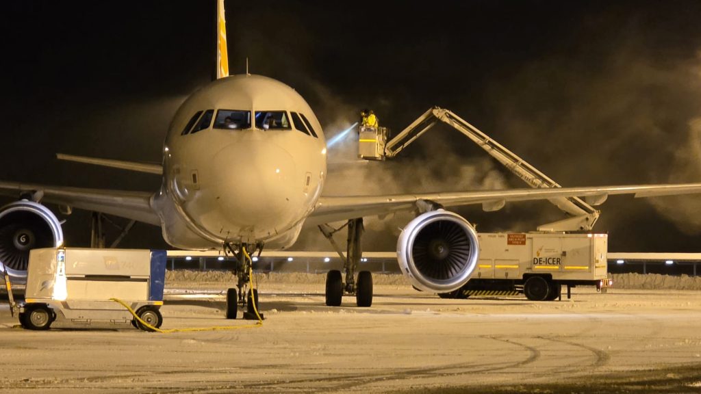 Door de winterse omstandigheden moet er ook extra werk worden verzet voordat vliegtuigen kunnen vertrekken. Zo moeten toestellen worden ge-de-iced. Dit ijsvrij maken is essentieel voor de veiligheid: ijsvorming kan de aerodynamische eigenschappen van het vliegtuig verstoren en losgekomen brokken ijs kunnen de motoren beschadigen.
